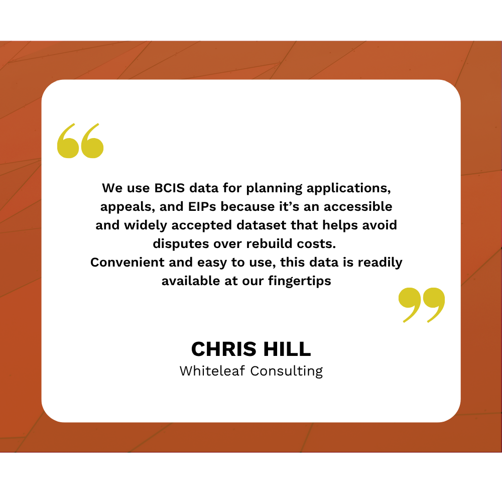 We value BCIS for its vast, easily accessible data that enhances our in-house analyses. It’s an essential, dependable tool for keeping pace with market trends, and we highly recommend it