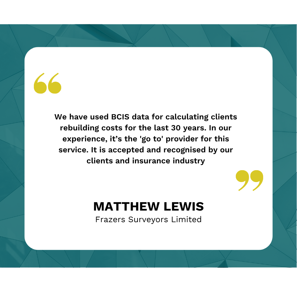 BCIS also allows us to calculate rebuild costs for insurance premiums and provide essential data for our estates and insurance teams. The service has become integral to our workflow and as a reputable source with a good industry reputation, it’s invaluable to have this assurance when evidencing costings.